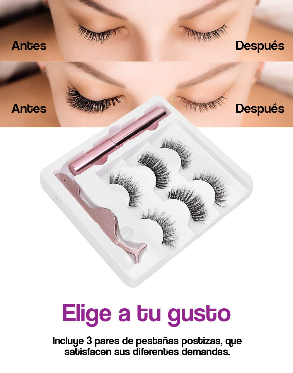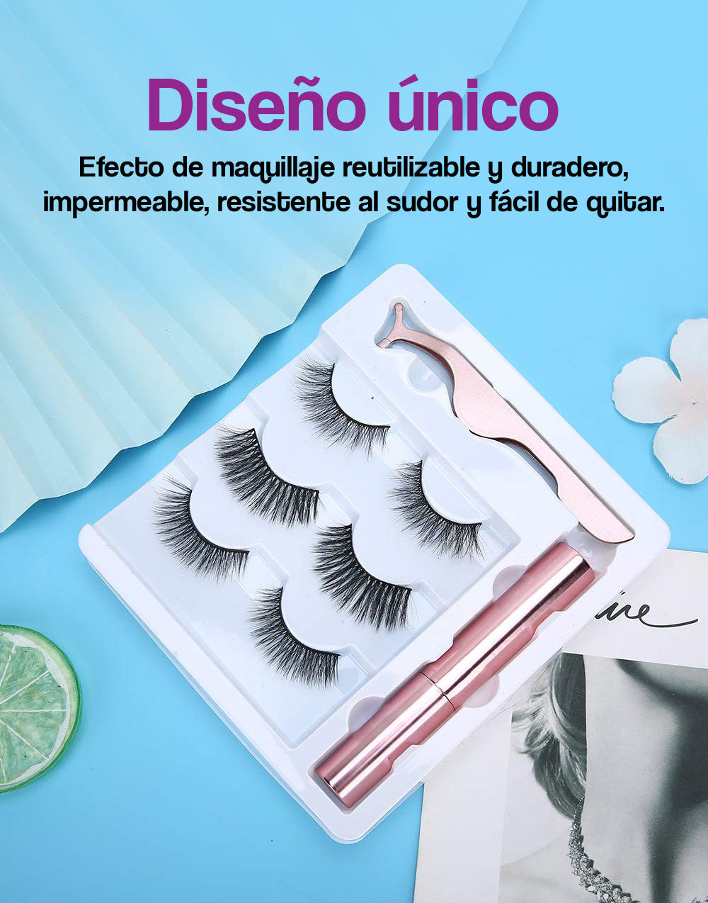 Pestañas fáciles de aplicar que permanecen todo el día. Cada juego de pestañas incluye un delineador de ojos, líquido magnético y pinzas aplicadoras.