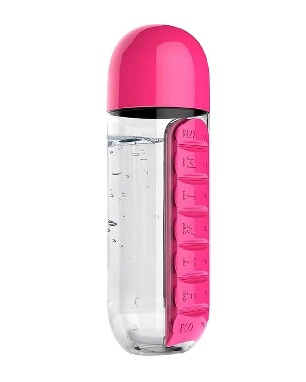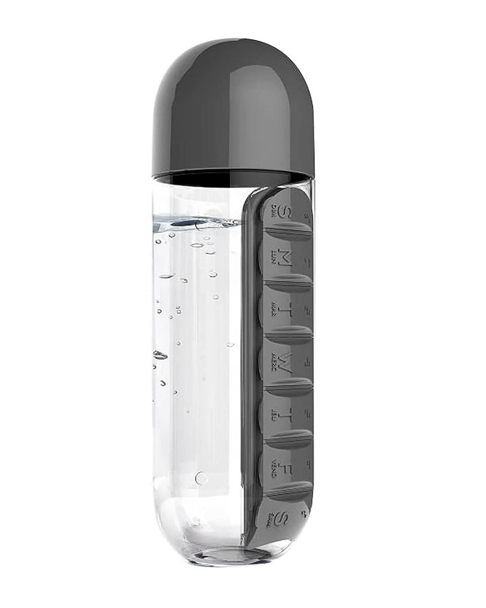 Botella de agua con pastillero y taza. Este modelo es muy conveniente, ya que puedes estar seguro de que no olvidarás tomar vitaminas y pastillas.