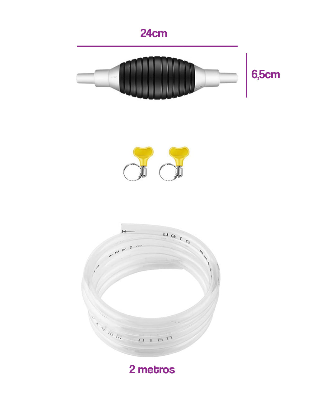 Es ideal para varias aplicaciones como cambios de agua de pecera, reemplazo de agua de vidrio, bombeo de aceite y transferencia de agua. Es compatible con equipos que no tienen filtros antirrobo, incluyendo cortadoras de césped, motocicletas, automóviles y tractores pequeños.Incluye una válvula de flujo para un cómodo control de flujo en la