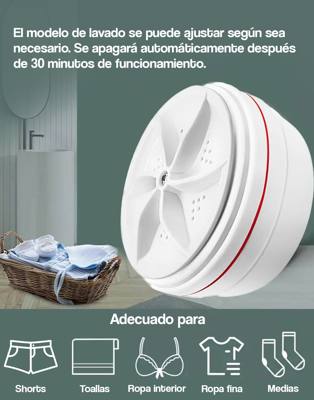 Alimentada por cable USB, te permite usarla en cualquier lugar. Cualquier cubo, lavabo o fregadero se puede usar para lavar la ropa. Para usarla fija la mini lavadora portátil, luego conecta la fuente de alimentación, pon la ropa y el detergente y añade agua, presiona el botón de encendido para iniciar el ciclo automático. El modo de operación es de 15 minutos para la rotación hacia adelante y 15 minutos para la rotación inversa. Todo el proceso dura 30 minutos. Después de 30 minutos, se apagará automáticamente. Reinicie después de un minuto y puede continuar usándolo.