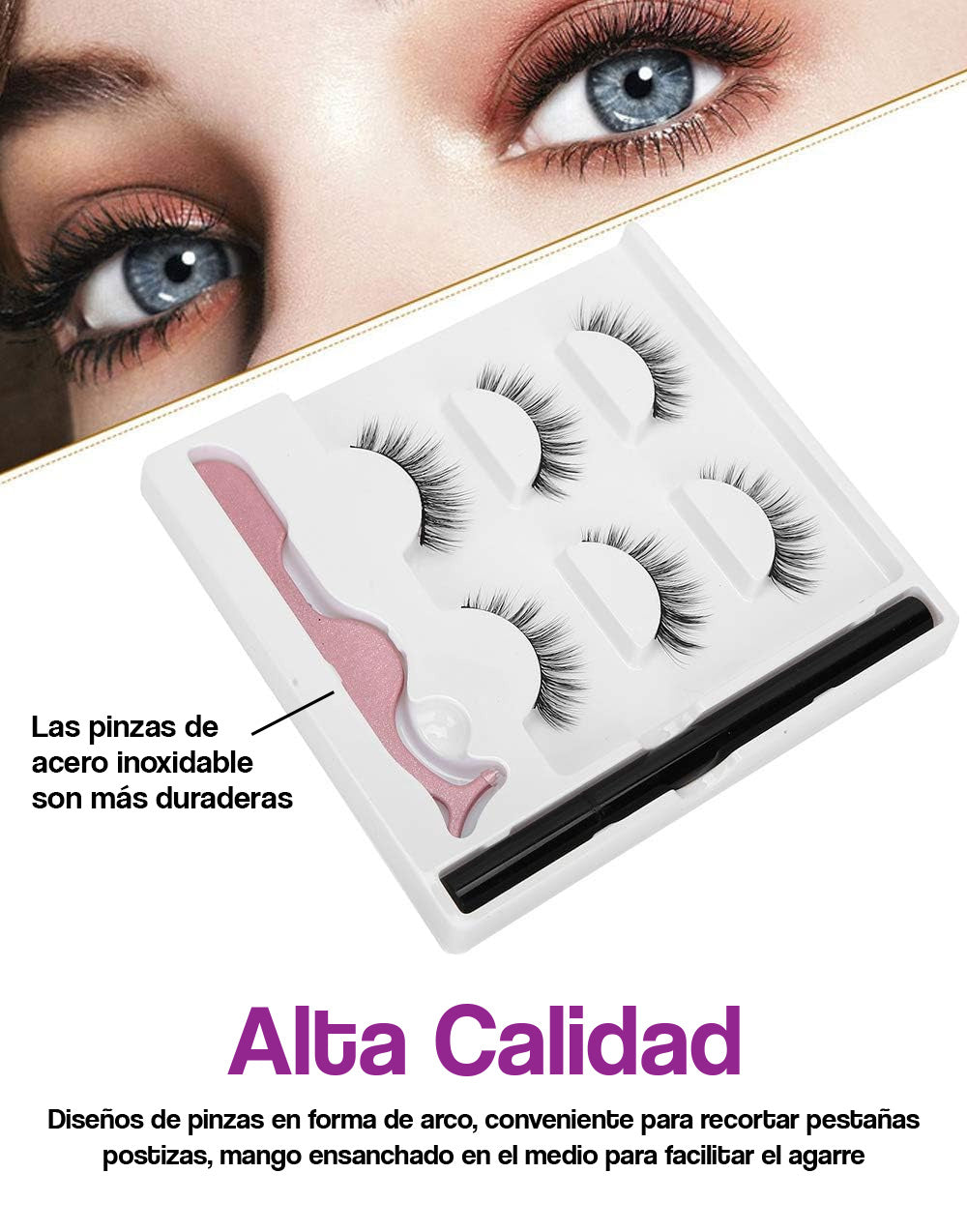 Pestañas fáciles de aplicar que permanecen todo el día. Cada juego de pestañas incluye un delineador de ojos, líquido magnético y pinzas aplicadoras.