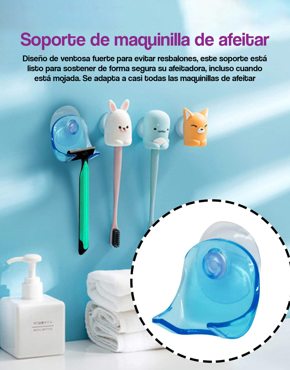 Diseño de ventosa fuerte para evitar resbalones, este soporte está listo para sujetar con seguridad su maquinilla de afeitar, incluso cuando está mojada. Se adapta a casi todas las maquinillas de afeitar.